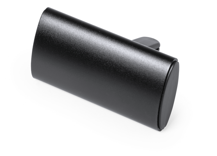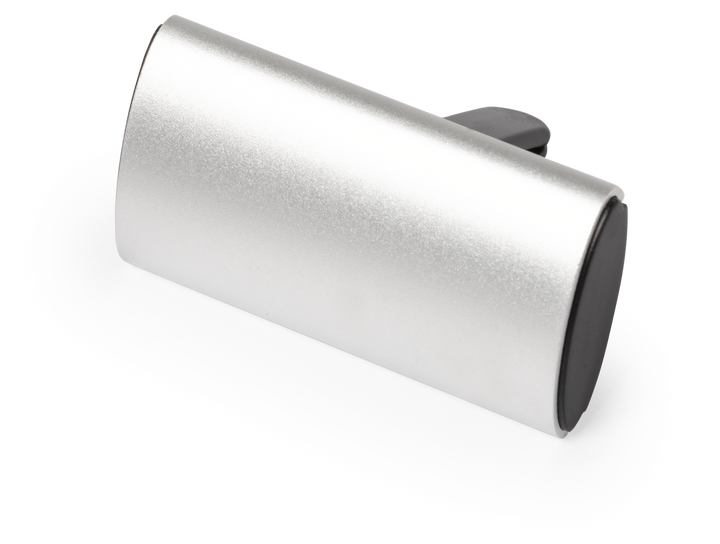 Ambientador para rejilla de coche en elegante diseño. Con frontal deslizante en aluminio granulado y resistente pinza para rejilla. Con bolitas de perfume de aroma limón y disponible en acabados plateado y negro.