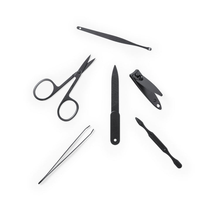 Maniküre-Set mit 6 Accessoires, mit Etui aus widerstandsfähigem RPET-Filz, das Ergebnis der Kombination des Recycling-Prozesses von Kunststoffen mit der tausendjährigen Technik der Filzherstellung, wodurch ein Öko-Trend-Material entsteht, das nicht nur recycelt wird, sondern auch wiederverwertbar ist. Metallzubehör aus rostfreiem Stahl mit schwarzem Finish: Schere, Pinzette, Nagelknipser, Nagelfeile und 2 Nagelhautentferner. Mit Knopfverschluss und unverwechselbarem RPET-Etikett auf der Außenseite.