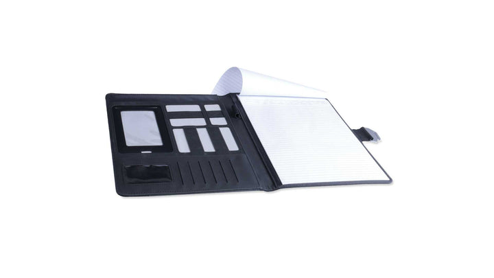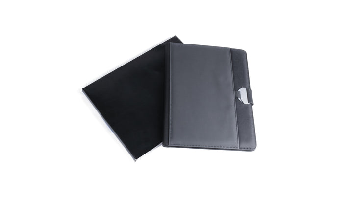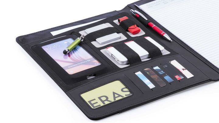 Mappe aus einer eleganten Polyester/Kunstleder-Kombination mit originellem Metallverschluss. Im Inneren mit Fächern für USB-Sticks und externen Akku, Smartphone-Hülle mit Touch-Funktion sowie Kartenfächern und Stifthalter. Mit herausnehmbarem Notizblock mit 20 Blättern. Präsentiert in einer eleganten schwarzen Box.