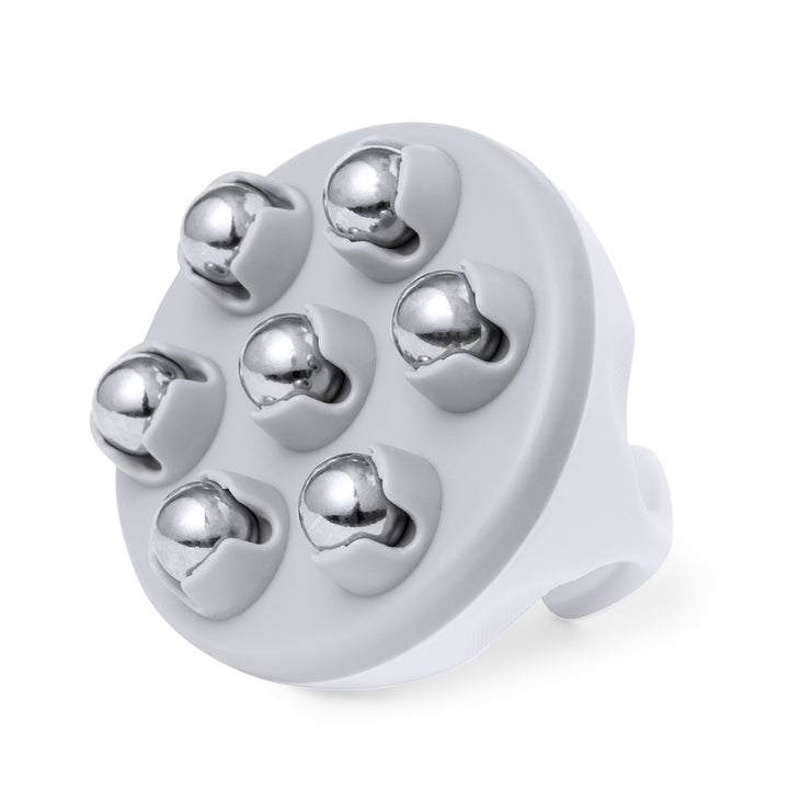 Massagegerät aus robustem ABS mit Metallkugeln. Entwickelt, um Linderung und Wohlbefinden zu bieten. Sein ergonomischer Griff sorgt für eine bequeme Handhabung, während die metallischen Kugeln mit Kalteffekt die Aufnahme von Lotionen unterstützen und müde Haut entspannen. Präsentiert in einer individuellen Kraft-Designbox.