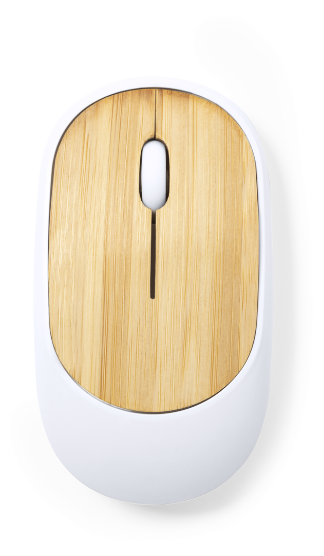 Ratón óptico inalámbrico de línea nature y con diseño ergonómico. Fabricado en resistente ABS de color blanco con superficie en bambú. Alimentación a pilas: 1xAA no incluida. Presentado en caja individual de diseño kraft.