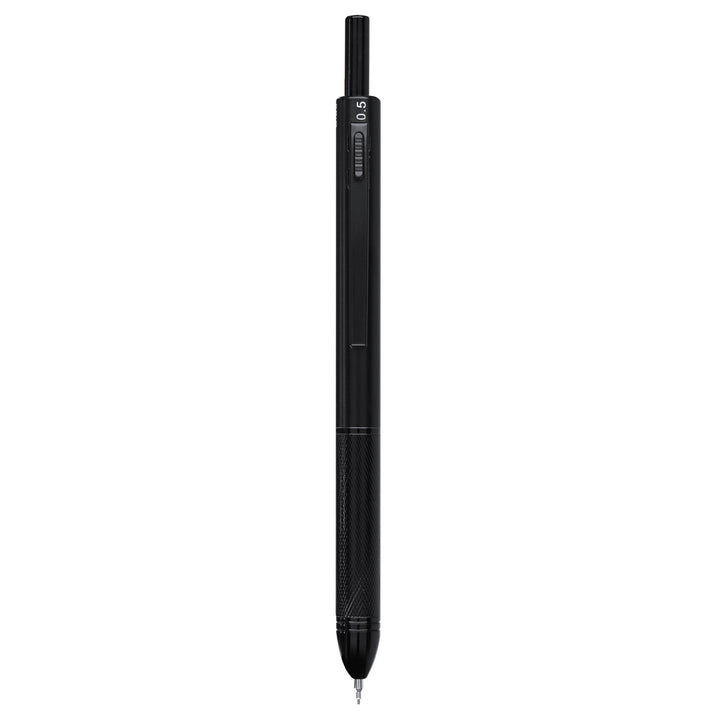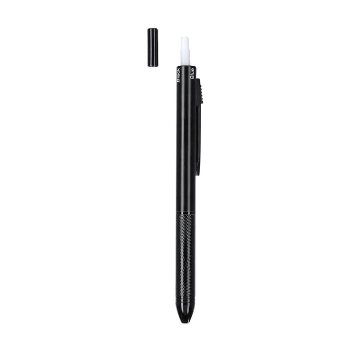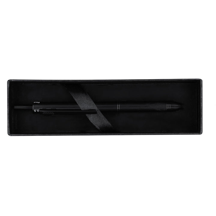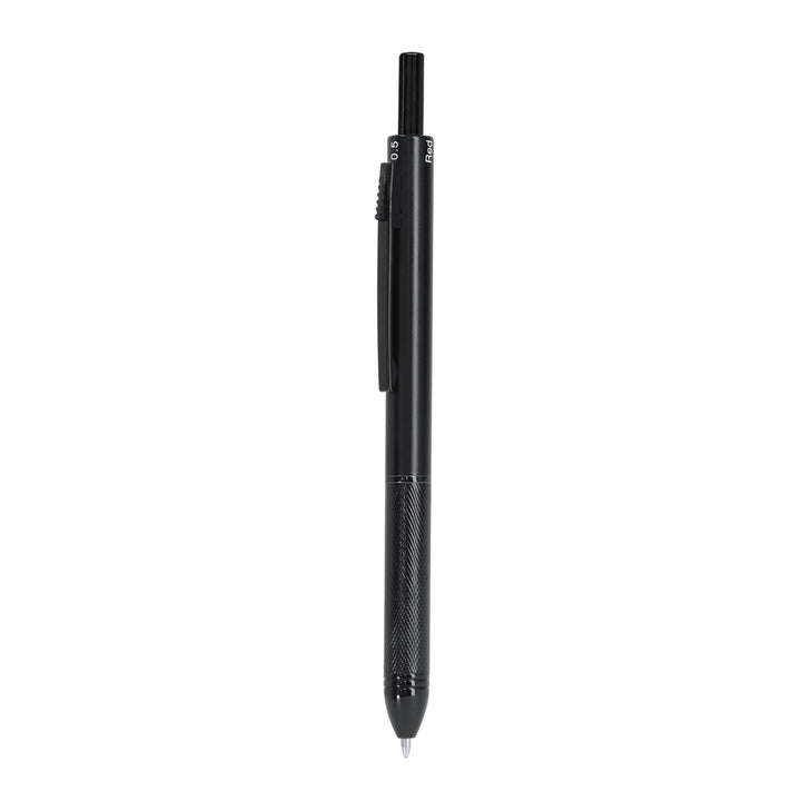 4-in-1 Kugelschreiber und Druckbleistift aus robustem Aluminium, mit intelligentem Mechanismus zur Auswahl der Tintenfarbe oder des Bleistifts. Optionen für blaue, schwarze und rote Tinte sowie Druckbleistiftfunktion. Inklusive 1 x 0,5 mm Mine, mit integriertem Radiergummi im Druckknopf. Ergonomischer Griff und passender Clip.