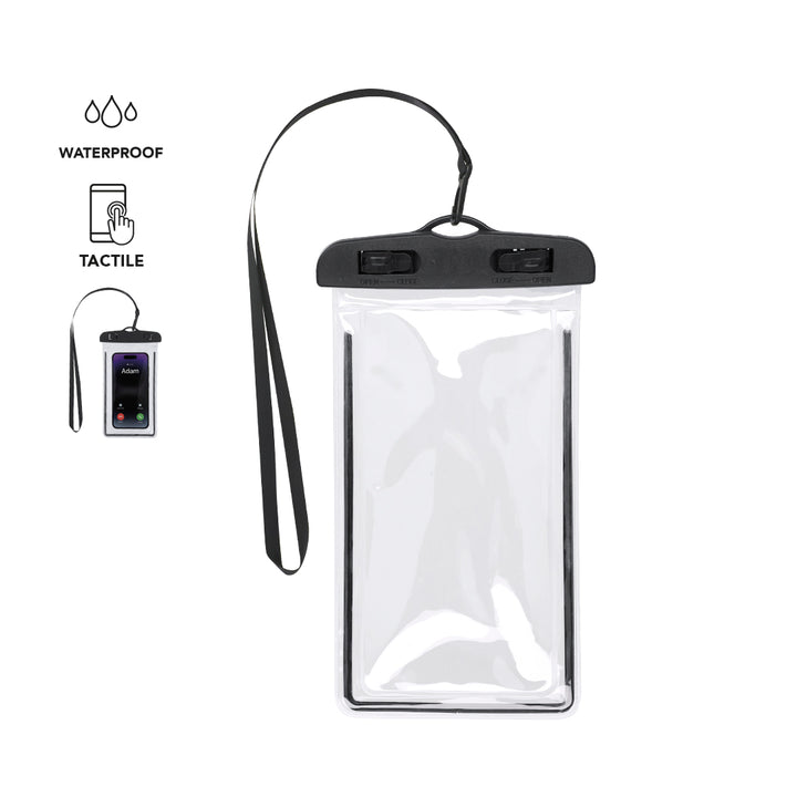 Wasserdichte Tasche aus PVC, entworfen mit Touch-Funktion für die einfache Nutzung von Geräten. Mit Sicherheitssystem und Klappverschluss für gute Dichtigkeit. Kompatibel mit Bildschirmen bis zu 6,7 Zoll. Enthält passendes Band und Karabiner für zusätzlichen Komfort.