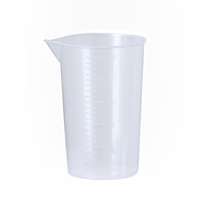 250 ml Messbecher aus widerstandsfähigem, transparentem PP. Mit seitlicher Anzeige in 10-ml-Segmenten und Ausgießer, um ein Verschütten zu verhindern.