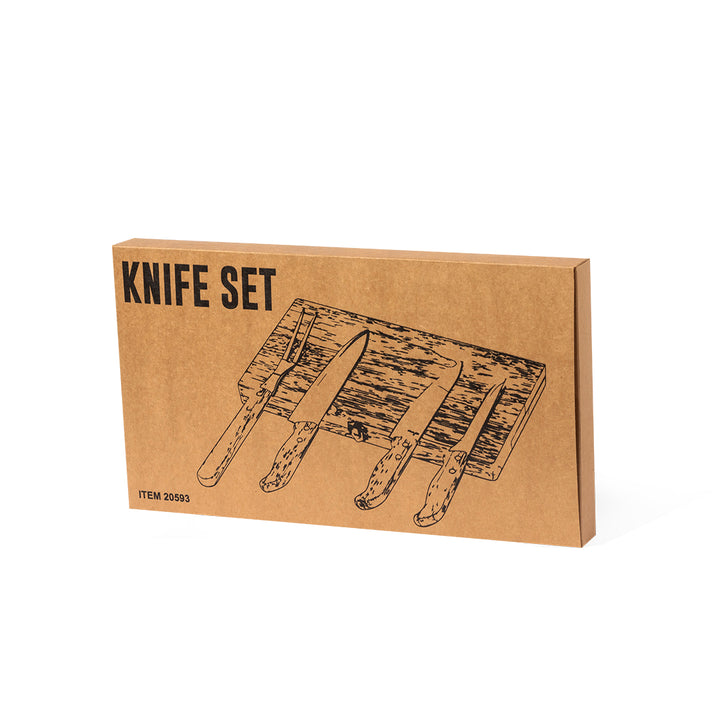 Messerset aus Naturholz und Edelstahl, im gestanzten Holzetui mit Metallschloss. Lieferumfang: Tranchiermesser, Ausbeinmesser, Filetiermesser und Kochmesser. Präsentiert in einer Kraft-Design-Box.