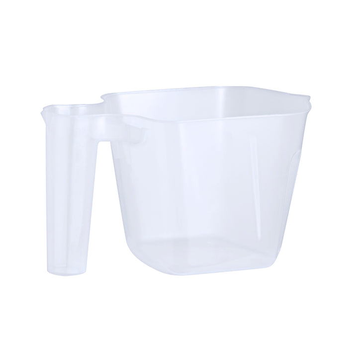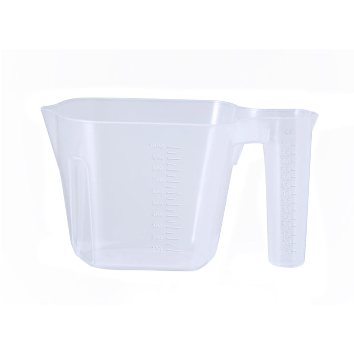 1L Messbecher aus widerstandsfähigem, transparentem PP, mit integriertem Messgriff. Hauptfach mit 1 Liter Fassungsvermögen, mit seitlicher Anzeige in 50-ml-Segmenten. Griff für eine genauere Probenahme, mit seitlicher Anzeige in 5-ml-Segmenten. Ausgießer, um ein Verschütten in beiden Behältern zu verhindern.