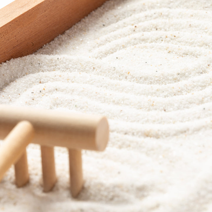Mini-Zen-Garten für Entspannung und Seelenfrieden. Container Basis und Harke aus Naturholz, mit 4 Natursteinen und einem kleinen Beutel mit weißem Sand. Präsentiert in einer individuellen Box mit Kraft-Design.