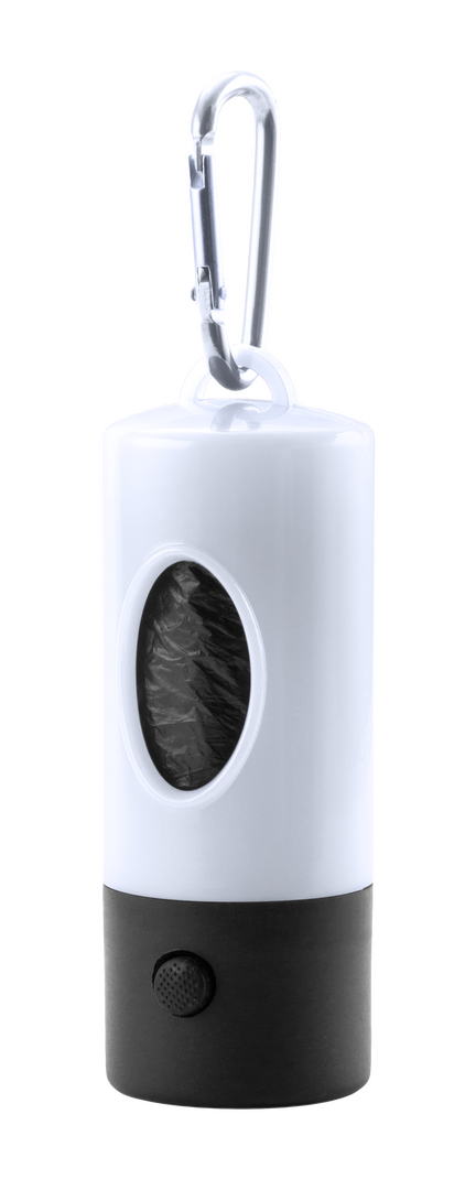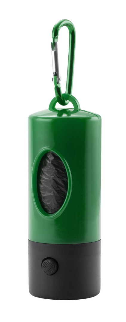 Dispensador de bolsas para mascotas con resistente cuerpo en vivos colores. Con linterna LED integrada. Incluye 15 bolsas.