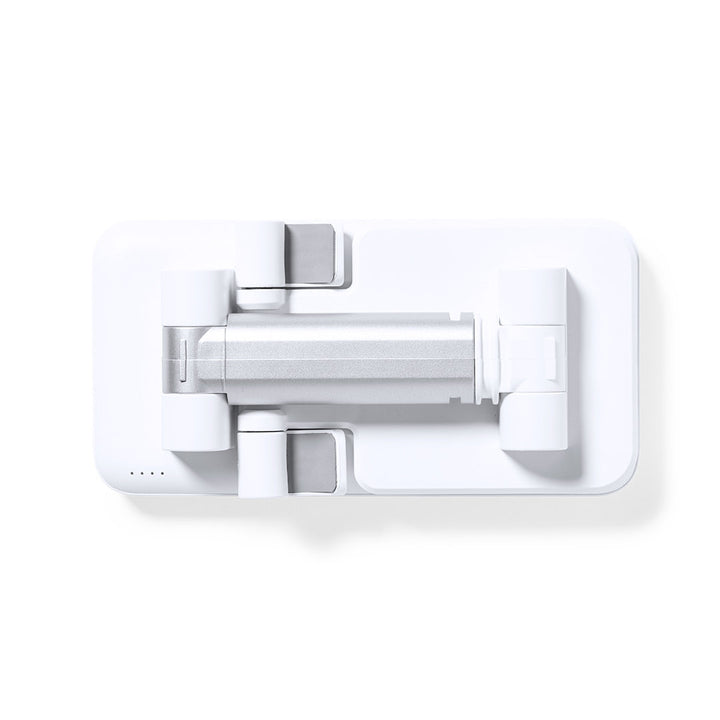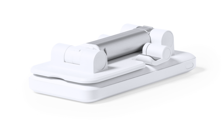 All-in-one faltbarer Multifunktionshalter, hergestellt aus strapazierfähigem weißem ABS. Verstellbar in Höhe und Winkel für eine optimale Sicht auf das Smartphone-Display. Integriertes drahtloses 10-W-Ladegerät und 5.000-mAh-Akku, mit Typ-C-Eingang/Ausgang, Micro-USB-Eingang und zwei USB-Ausgängen. Kompatibel mit drahtlos aufladbaren Mobilgeräten, inklusive Typ-C-Ladekabel und präsentiert in einer attraktiven Designbox.Alle unsere externen Zusatzakkus haben eine reale Kapazität und bestehen aus nicht recycelten Akkus der Klasse A mit einer Lebensdauer von mindestens 500 Ladezyklen, die den CE-Vorschriften entsprechen. Darüber hinaus werden sie gemäß den RoHS-Normen und unter Einhaltung der folgenden Sicherheitsanforderungen hergestellt: Überladungsschutzsystem der Powerbank. Vollständiges Entladeschutzsystem, das die Lebensdauer der Powerbank erhöht. Blockiersystem zur Vermeidung von Kurzschlüssen. Konstantes Ladetransfersystem, entsprechend der Kapazität des Zielgeräts.