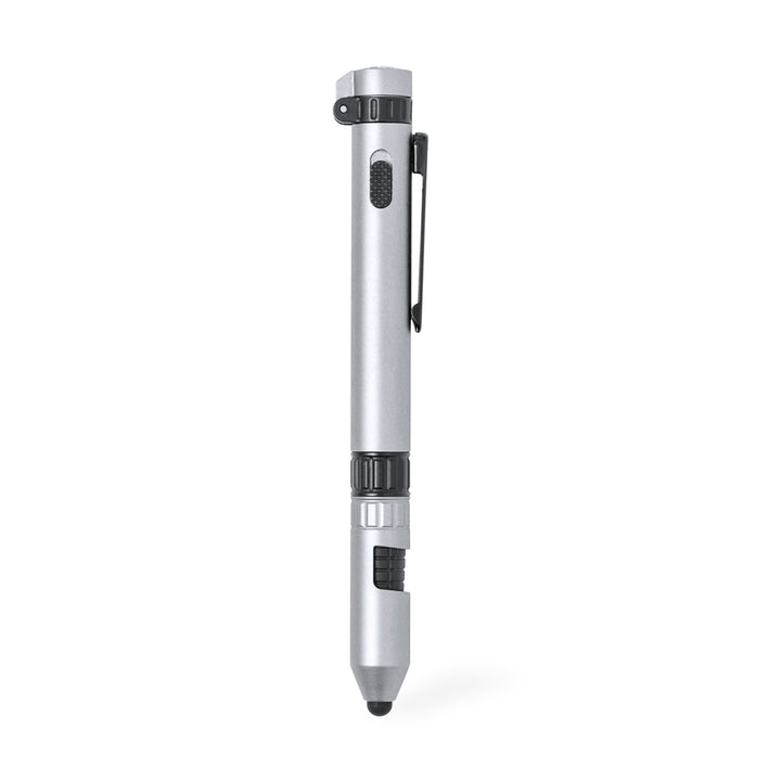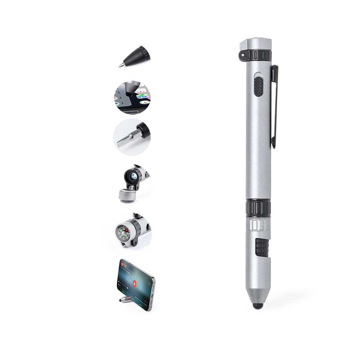 Dieser Kugelschreiber kombiniert 7 nützliche Funktionen in einem Gerät: Neben einem blauen Tintenstift bietet er eine Taschenlampe, betrieben durch im Lieferumfang enthaltene Knopfzellen, sowie einen Stylus für Touchscreen-Geräte. Der Handyhalter sorgt für bequemen Halt, während der integrierte Kompass und die Flach- und Kreuzschlitzschraubendreher für praktische Anwendungen unterwegs sorgen.