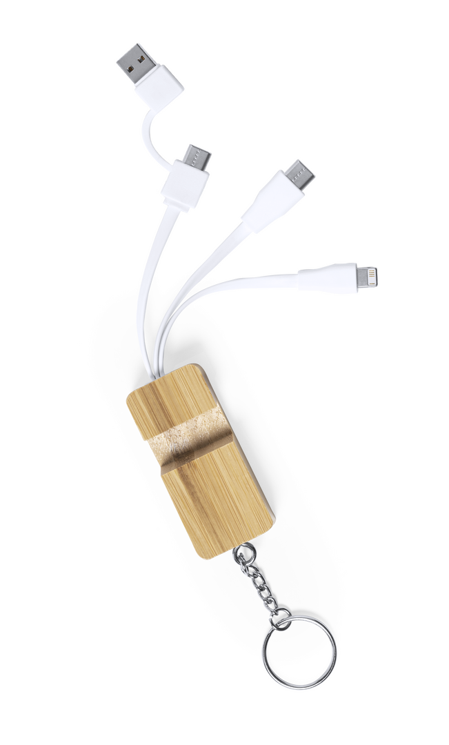 Linie "Natur" Ladegerät mit Schlüsselring und Smartphone-Halter. Aus strapazierfähigem Bambus mit lackierter Oberfläche, einschließlich Typ-C-Anschluss (Eingang und Ausgang) und Dual Micro-USB / Lightning. Präsentiert in einer attraktiven, öko-designten Einzelverpackung.