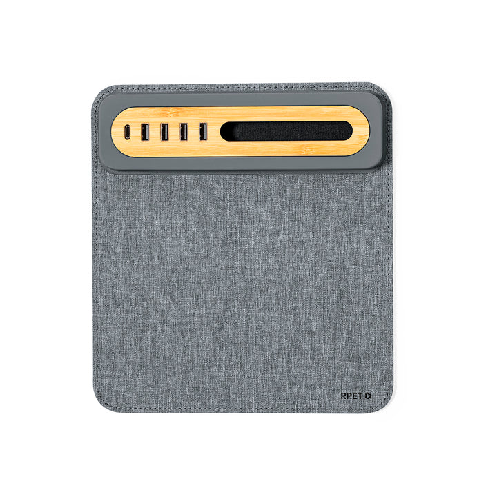 Elegantes und funktionales Mauspad aus einer Kombination aus weichem RPET-Polyester und Bambus. Mit Type-C-Anschluss und vier USB-2.0-Anschlüssen, über die Sie Ihre Geräte einfach anschließen und aufladen können. Mit Smartphone-Halterung und rutschfester Unterlage für eine komfortable und stabile Nutzung. Führt eine neue Ära der Konnektivität und Nachhaltigkeit im Arbeitsbereich ein.Präsentiert in einer individuellen Kraft-Design-Box und einer recycelten Tasche.Das RPET-Material wird aus recyceltem Kunststoff hergestellt, wodurch die Wiederverwendung von Kunststoffabfällen gefördert und die Nachhaltigkeit unseres Planeten unterstützt wird.