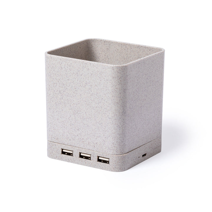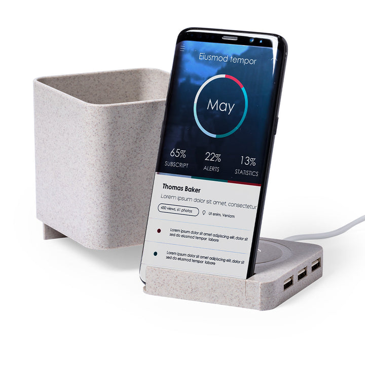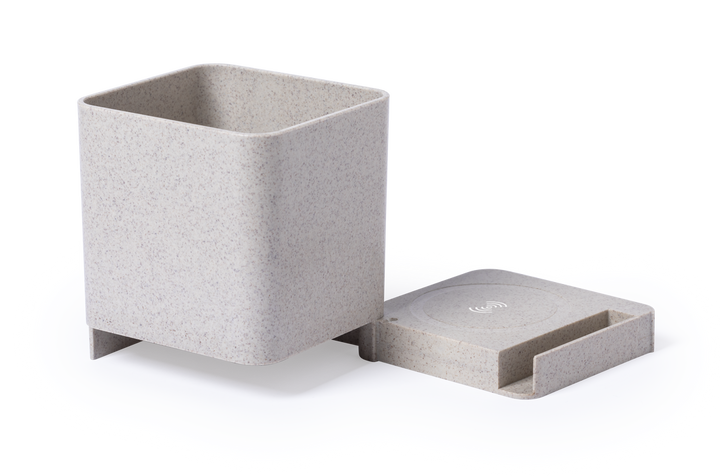 4 in 1 Multifunktionsstifthalter aus unserer Naturlinie. Hergestellt aus Weizenstroh, um die Verwendung natürlicher Rohstoffe zu fördern und Schadstoffemissionen zu reduzieren.Mit Stifthalter, Smartphone-Halter, drahtlosem Ladegerät und USB-Port (3xUSB 2.0) Funktionen. Kompatibel mit Smartphones, die mit drahtloser Ladetechnologie ausgestattet sind. Inklusive 1 Meter langem, weißem Mikro-USB-Kabel. Präsentiert in einer attraktiven Ökodesign-Box. Bedienungsanleitung in Spanisch und Englisch erhältlich.