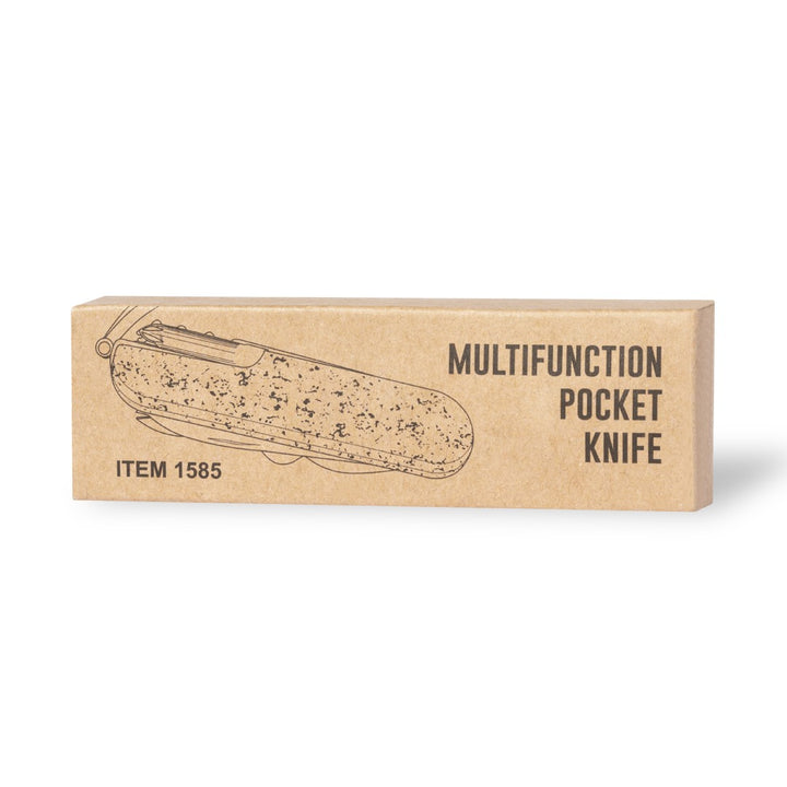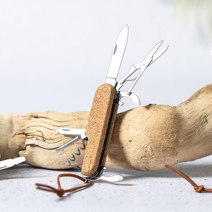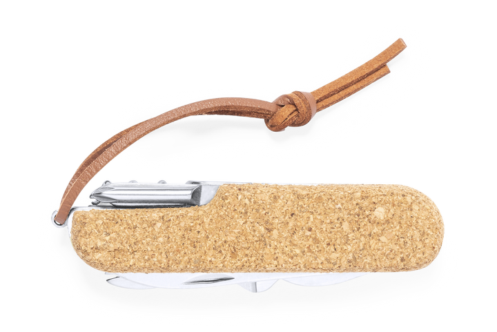 Navaja multiusos de línea nature, con resistente cuerpo en acero inox y empuñadura de corcho natural. Con 9 funciones entre otras, navaja, abridor, tijeras, lima, destornillador con puntas plana y philips, sacacorchos… Cordón a juego en polipiel y presentada en caja individual de diseño kraft.