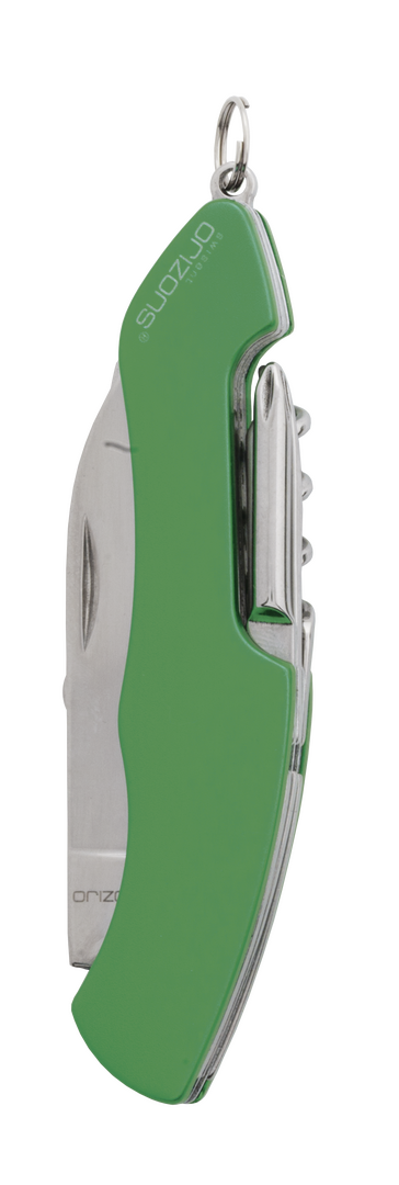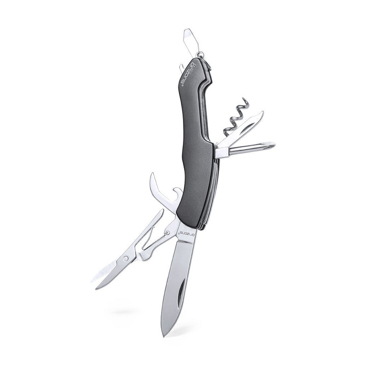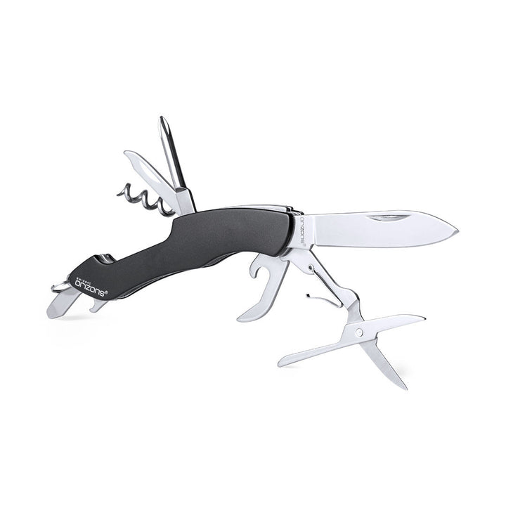 Vielseitig verwendbares Taschenmesser von Orizons mit 10 Edelstahl-Funktionen und Aluminiumgriff in lebendigen Farben. Mit Messer, Schere, Dosenöffner, Flaschenöffner mit Schlitzschraubendreher, Kreuzschraubendreher, Schlagdorn mit Feile und Korkenzieher. Mit Schlüsselring. Präsentiert in einer attraktiven Designbox mit dem Markenlogo.