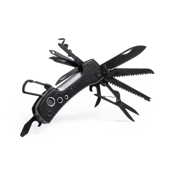 Mehrzweckmesser mit Zubehör aus rostfreiem Stahl mit schwarzem Finish. Dazu passender, widerstandsfähiger Aluminiumgriff mit integriertem Karabiner. 13 Funktionen, darunter Messer, Schraubendreher, Feile, Öffner und Schere. Zusammenklappbar und kompakt in der Größe, präsentiert in einer individuellen Box in schwarzem Design.