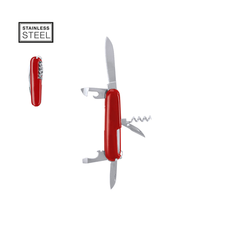 Multifunktionsmesser mit Edelstahl-Zubehör mit 8 Funktionen, beschichtet mit widerstandsfähigem ABS. Enthält zwei Messer in unterschiedlichen Größen, Stechwerkzeug, Korkenzieher, Zahnstocher, Nähnadel, Dosenöffner und Flaschenöffner.