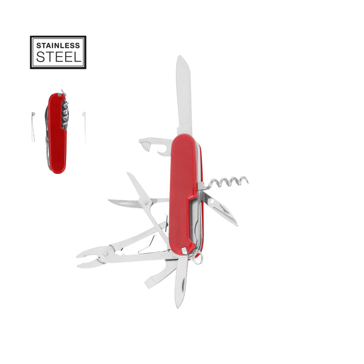 Multifunktionsmesser mit Edelstahl-Zubehör mit 10 Funktionen, beschichtet mit widerstandsfähigem ABS. Enthält zwei Messer in unterschiedlichen Größen, Schere, Zange, Stechwerkzeug, Korkenzieher, Zahnstocher, Nähnadel, Dosenöffner und Flaschenöffner.
