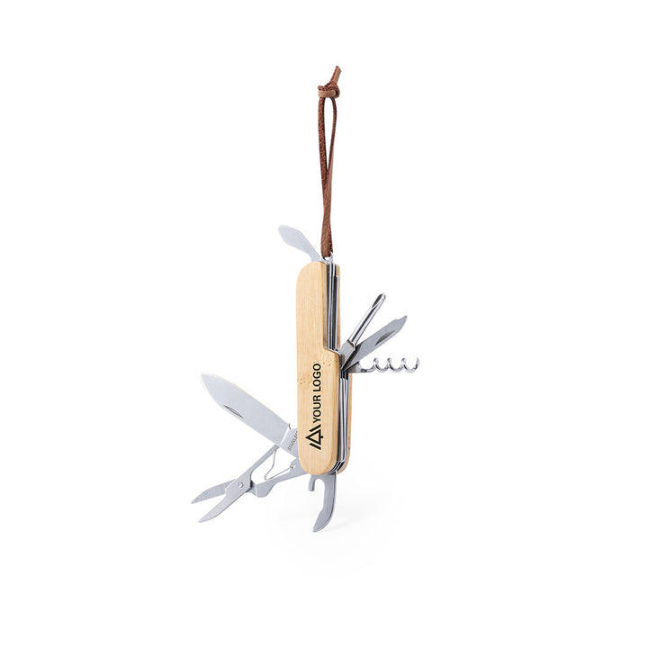 Mehrzweckmesser der Nature Line, in Kombination der Materialien Bambus und Edelstahl, mit 9 Funktionen. Beinhaltet Messer, Öffner, Schere, Feile, Schraubendreher, Korkenzieher... Mit Kunstleder-Trageriemen und präsentiert in individueller Box.