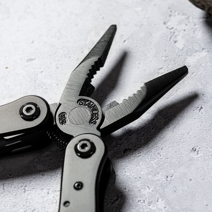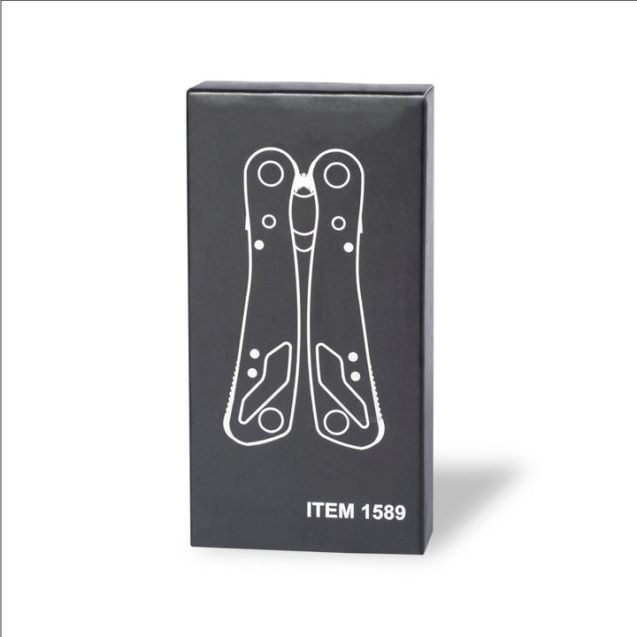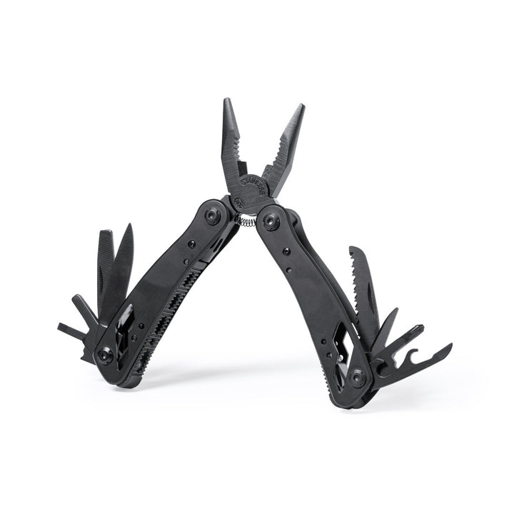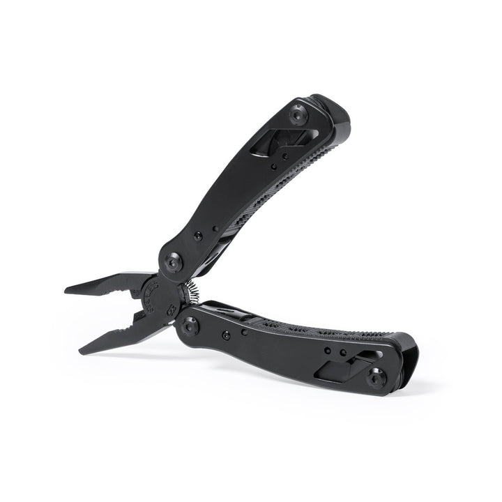 Multitool mit Zubehör aus rostfreiem Stahl mit schwarzem Finish und passendem, widerstandsfähigem Aluminiumgriff. Mit 13 Funktionen, darunter Messer, Schraubendreher, Feile, Öffner und Zange. Zusammenklappbar und kompakt in der Größe, präsentiert in einer individuellen Box in schwarzem Design.