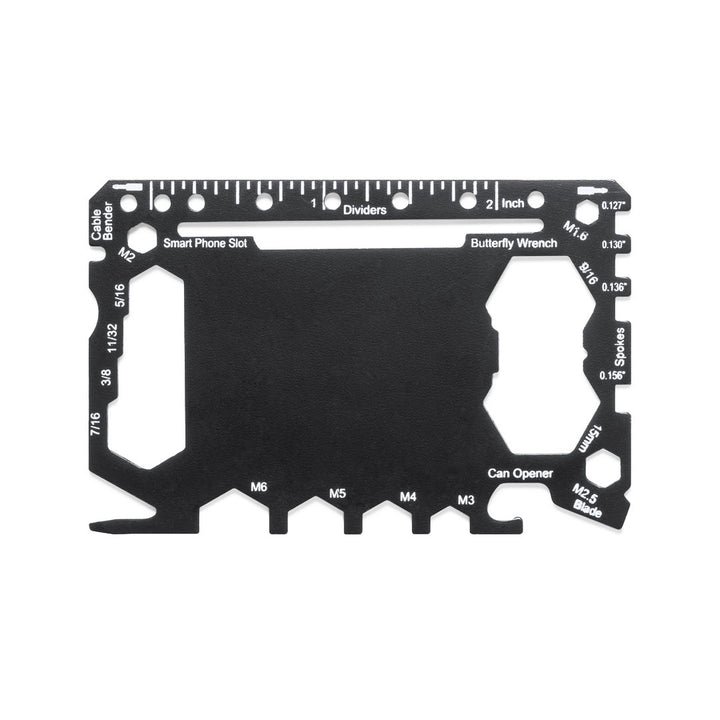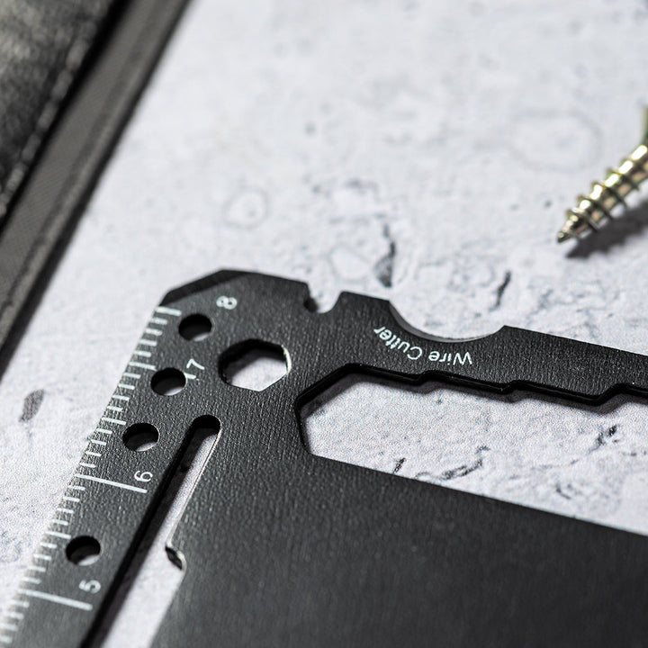 Multitool mit robustem Gehäuse aus rostfreiem Stahl und 17 Funktionen. Unter anderem: Dosenöffner, Messer, Schraubendreher, Lineal, Flaschenöffner, Schraubenschlüssel, Butterfly-Schlüssel und Winkelmesser.