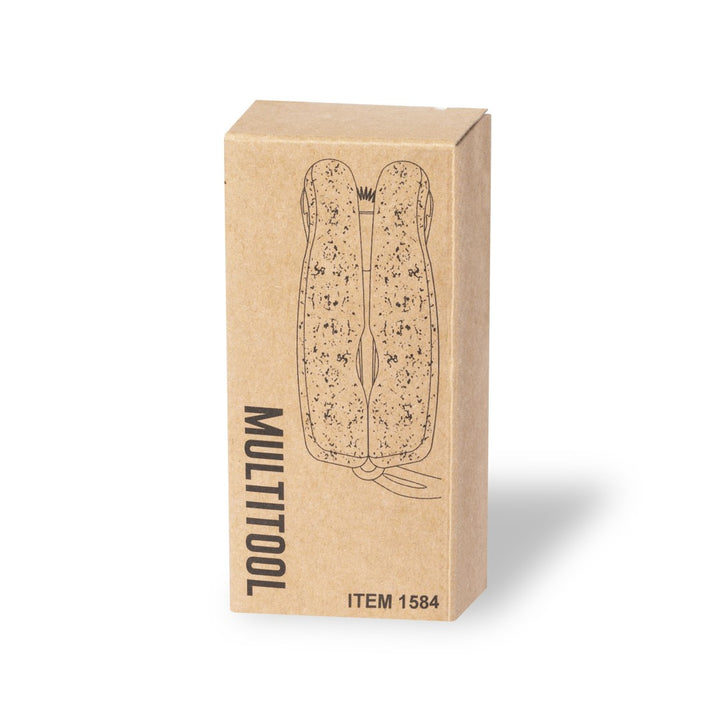 Multiherramienta de línea nature, con resistente cuerpo en acero inox y empuñadura de corcho natural. Con 12 funciones, entre otras cuchillo y navaja destornillador con puntas planas y philips lima abridor y alicates. Cordón a juego en polipiel y presentada en caja individual de diseño kraft.