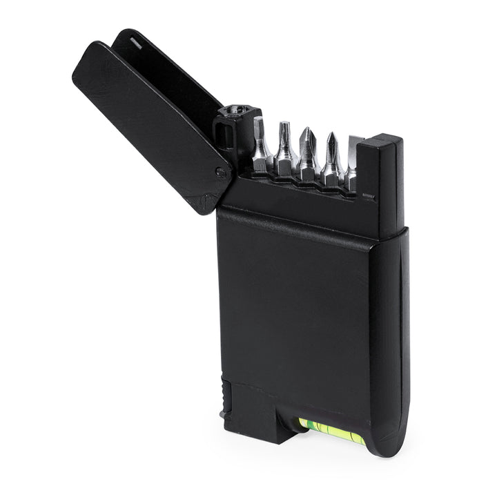 - Funktionen: 3-Meter-Maßband, Schraubendreher mit verschiedenen Bits, integrierte Wasserwaage