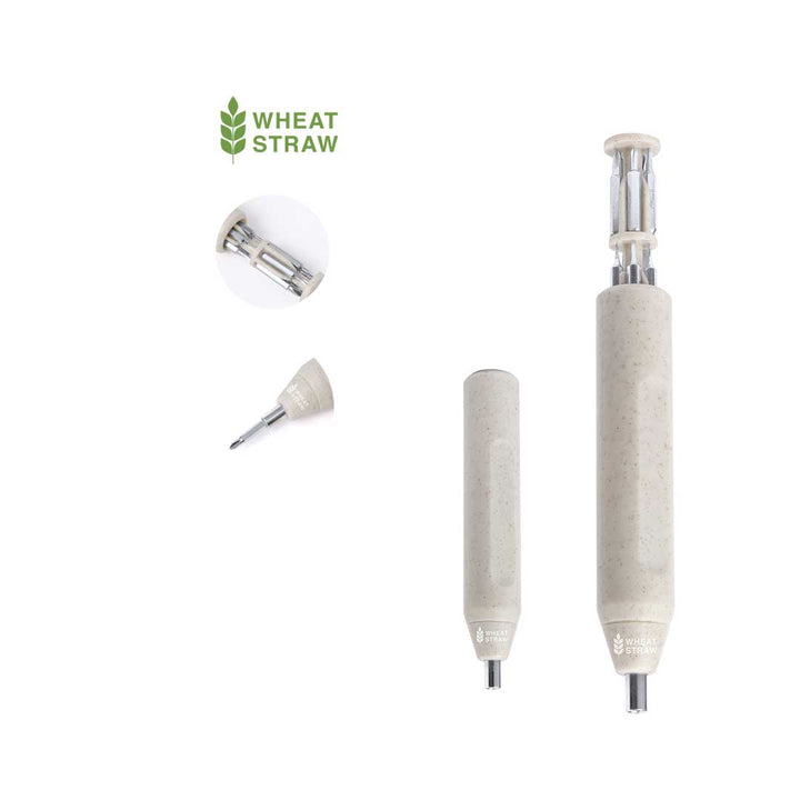 Ein besonderes Highlight ist der integrierte Schraubendreher, der mit einem cleveren magnetischen Fach im Griff ausgestattet ist, in dem verschiedene Bits sicher aufbewahrt werden können. Das Set umfasst sowohl Flach- als auch Kreuzschlitz-Bits, sodass Sie für jede Aufgabe bestens vorbereitet sind. Das Weizenstroh-Logo auf dem Griff betont die nachhaltige Herstellung dieses vielseitigen Werkzeugs.