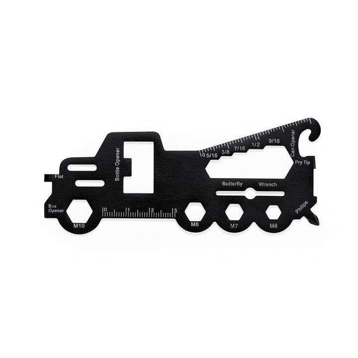 Cooles und praktisches Multitool aus Edelstahl in Form eines Lastwagens. Mit 18 Funktionen, unter anderem: Schlitz- und Kreuzschlitzschraubendreher, Sechskantschlüssel in verschiedenen Größen, Lineal, Dosenöffner und Flaschenöffner. Präsentiert in einer recycelten Papiertüte.