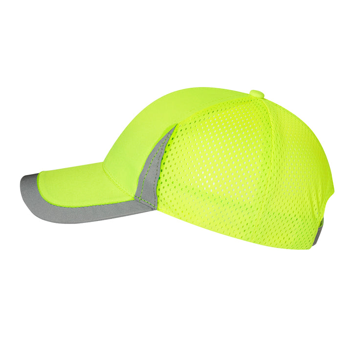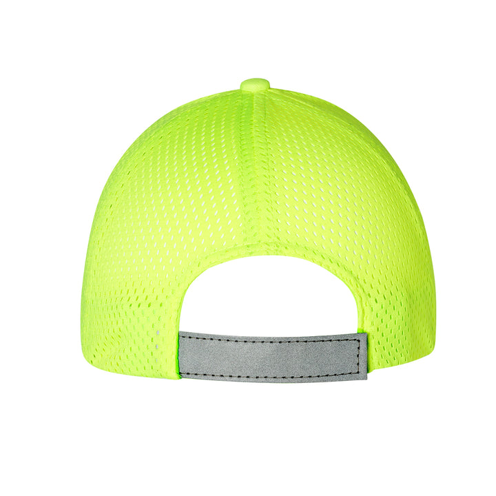 Sportmütze aus weichem Polyester. Verstellbarer Klettverschluss und atmungsaktiver Netzrücken. In fluoreszierendem Gelb mit reflektierenden Details an Schirm, Front und Verschluss.