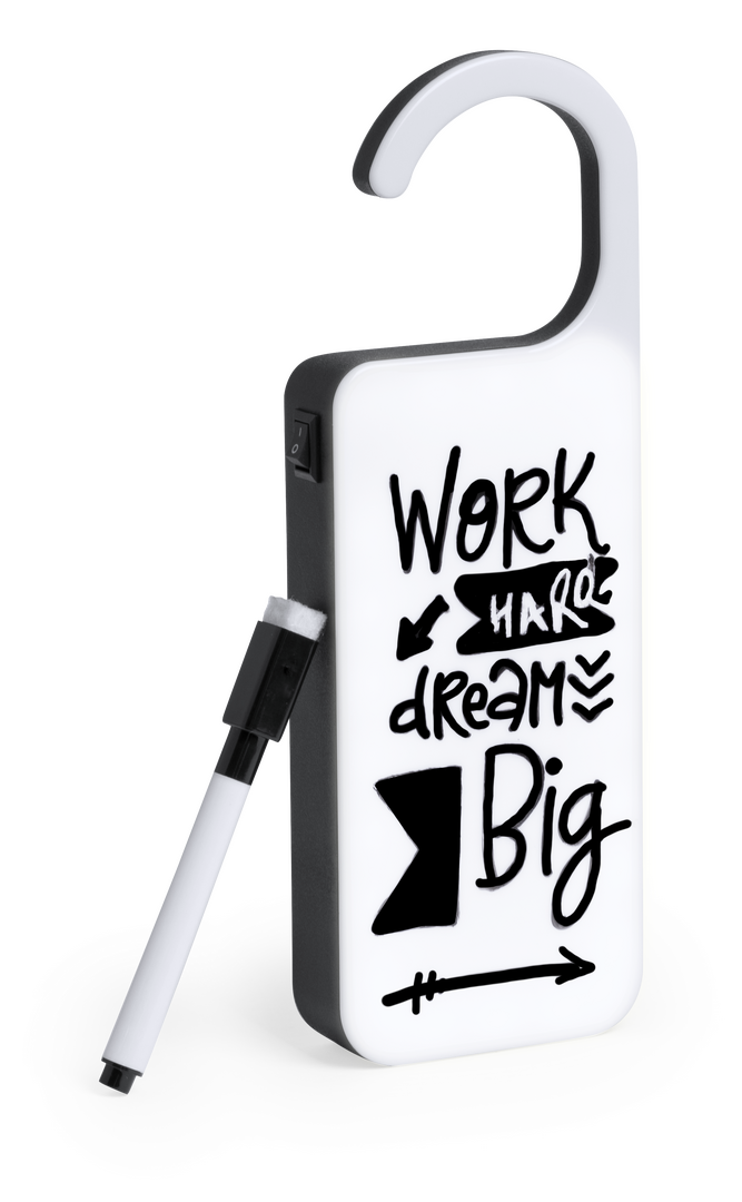 Colgador para mensajes con brillate luz interior (25 LEDs), para que todo el mundo pueda ver tus mensajitos. Botón de encendido ON/OFF, con rotulador de tinta negra y borrador. Alimentación a pilas (3xAAA no incluidas) y compartimento para guardar el rotulador. Presentada en atractiva caja de diseño.