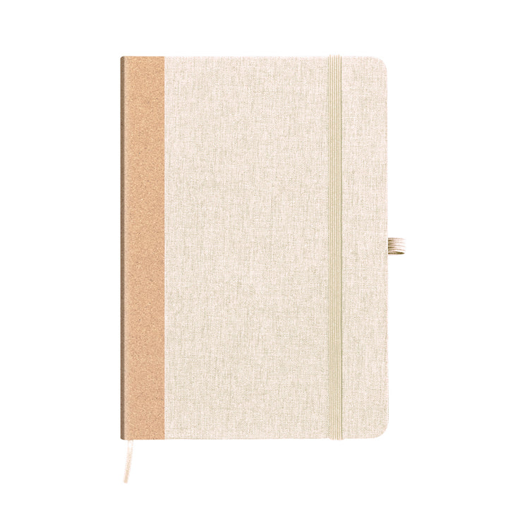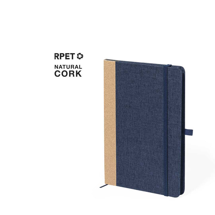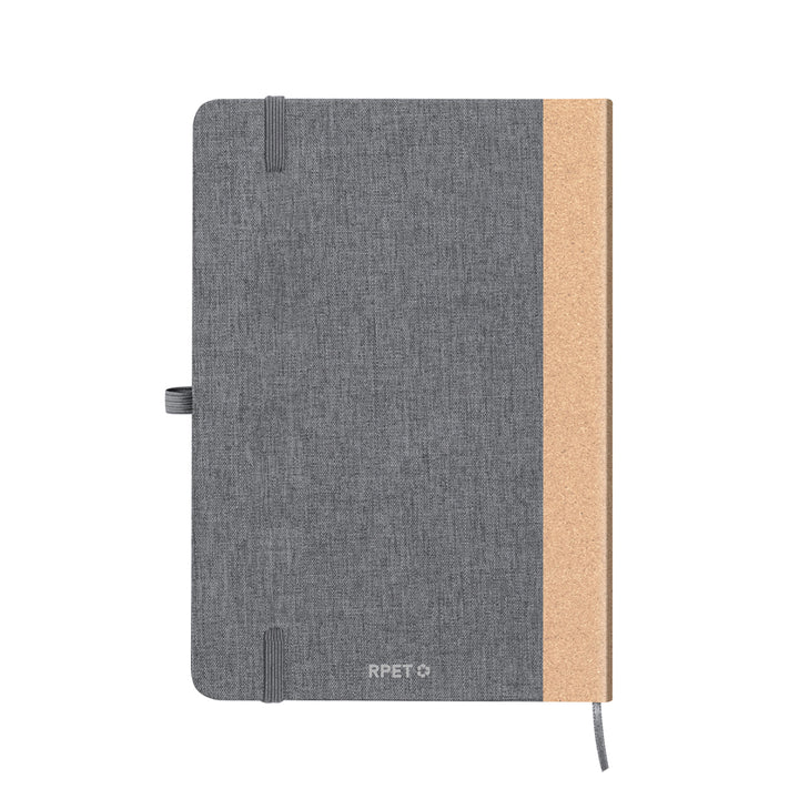 Der Einband aus RPET und der Korkrücken geben dem Notizbuch eine edle Optik und angenehme Haptik. Zusätzlich sorgt ein elastisches Verschlussband zusammen mit einem praktischen Lesezeichen und einem Kugelschreiberhalter für eine optimale Handhabung und Ordnung. Das RPET-Logo auf der Rückseite hebt die nachhaltige Herstellung hervor.