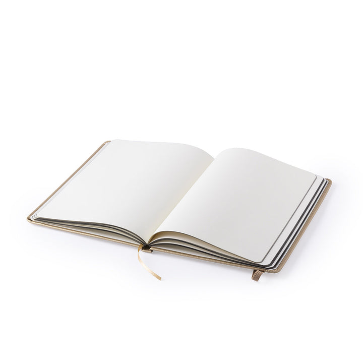 Notizblock aus Kunstleder in auffälligen Metallic-Farben. Erhältlich in Gold, Silber und Roségold. Mit stabilem Cover, Gummibandverschluss und farblich passendem Lesezeichenband. Mit 80 Blättern in Naturfarbe.