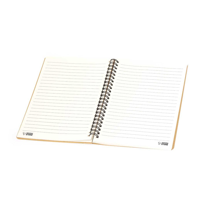Die 70 weißen, linierten Seiten aus Steinpapier zeichnen sich durch ihre besondere Widerstandsfähigkeit aus. Sie sind wasserabweisend, reißfest und abwaschbar, was sie langlebig und vielseitig einsetzbar macht. Jedes Blatt trägt das Natural-Stone-Logo, das die nachhaltige Herstellung aus Steinextrakten hervorhebt. Ein zusätzliches Informationsblatt im Inneren erläutert den innovativen Fertigungsprozess, wodurch die ökologische Philosophie dieses Produkts unterstrichen wird.
