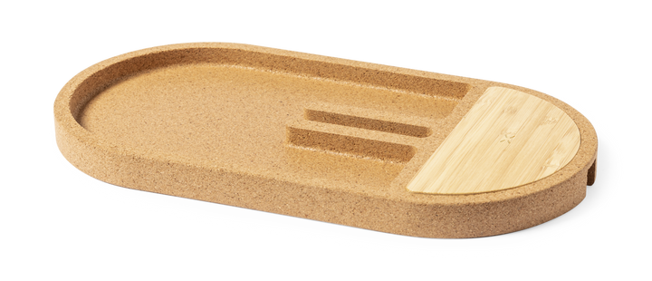 Kabelloser Organizer-Ladegerät mit 15W Leistung. Die Basis besteht aus Naturkork und die Ladefläche aus Bambus. Es verfügt über eine integrierte Smartphone-Halterung und Stauraum für Büroartikel. Es ist kompatibel mit Geräten mit Qi kabelloser Ladetechnologie, hat eine LED-Ladeanzeige und ein Typ-C-Ladekabel ist im Lieferumfang enthalten. Die Basis ist rutschfest und wird in einer individuellen Kraft-Design-Box mit Anleitung in Spanisch und Englisch geliefert. Es ist gemäß den RoHS-Standards hergestellt und erfüllt die folgenden Sicherheitsanforderungen: Schutzsystem gegen Überhitzung.Schutzsystem gegen Überladung.Verriegelungssystem zur Vermeidung von Kurzschlüssen.