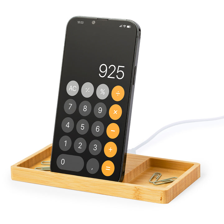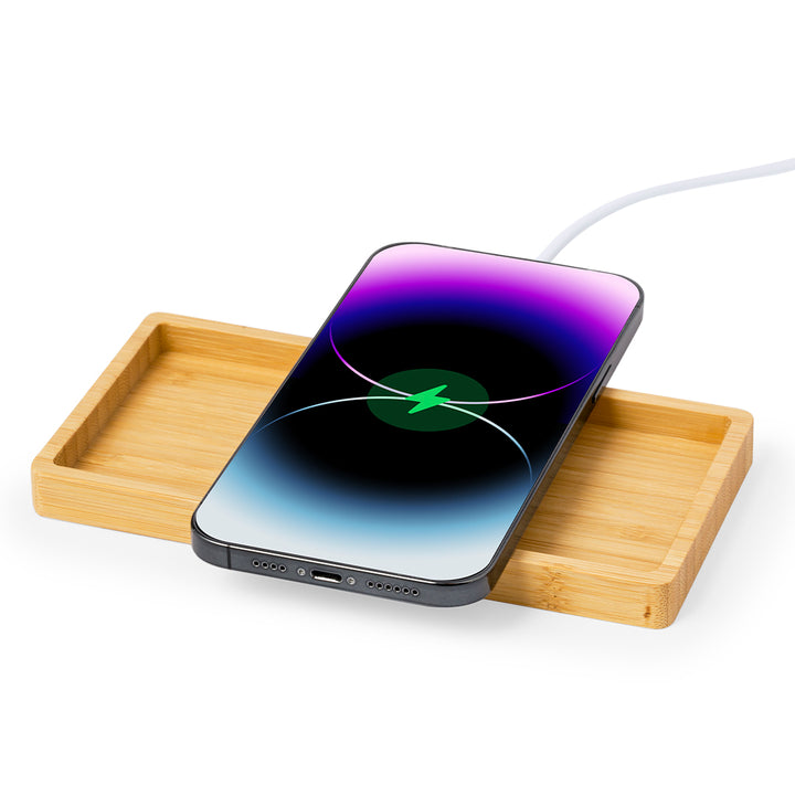 Kabelloses Ladegerät und Organizer 15W, aus Bambus. Mit Smartphone-Halterung und zusätzlichen Fächern für Gegenstände, kompatibel mit Geräten, die mit kabelloser Ladetechnik ausgestattet sind. Große Brandingfläche und präsentiert in einer individuellen Kraftbox. Gebrauchsanweisung in Englisch und Spanisch erhältlich.Materialien wie Bambus fördern die Verwendung von natürlichen Rohstoffen und reduzieren die Schadstoffemissionen. Es handelt sich um eine sehr widerstandsfähige und vielseitige Pflanze, die schnell wächst und sich regeneriert, was sie zu einer hervorragenden Alternative zu herkömmlichem Holz macht.Hergestellt gemäß den RoHS-Normen und unter Einhaltung der folgenden Sicherheitsanforderungen:Überhitzungsschutzsystem.Überladungsschutzsystem.Blockiersystem zur Vermeidung von Kurzschlüssen.