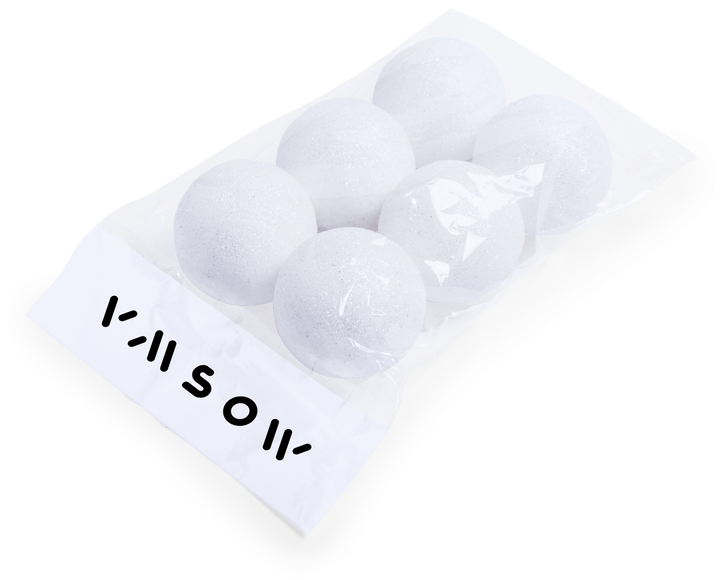 Set aus 6 Weihnachtskugeln zum Aufhängen in verschiedenen kräftigen Metallic-Farben. Präsentiert in einem individuellen Beutelchen mit weißer Druckfläche.