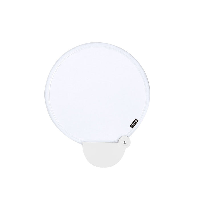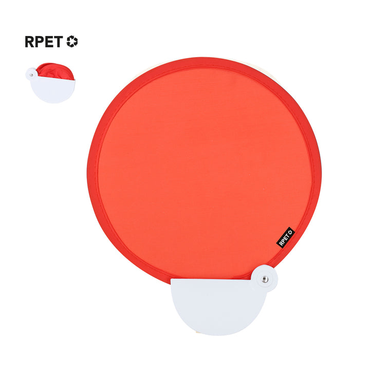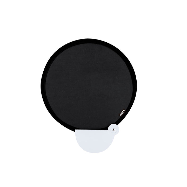 Faltbarer Fächer aus RPET. Dank des Faltmechanismus leicht zu transportieren, enthält eine RPET-Kennzeichnung.Das RPET-Material wird aus recyceltem Kunststoff hergestellt, um die Wiederverwendung von Kunststoffabfällen zu fördern und zur Nachhaltigkeit des Planeten beizutragen.