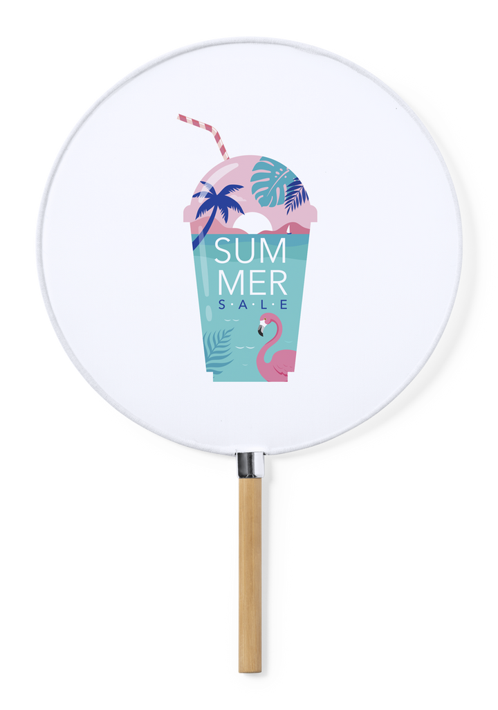 Elegante Pai Pai fabricado en resistente poliéster especial para sublimación. Con mango en bambú y detalle en cromado.