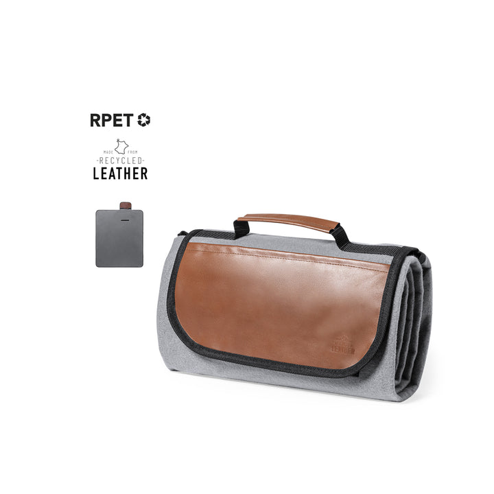 Die Unterseite ist mit einer PEVA-Isolierschicht ausgestattet, die Schutz vor Feuchtigkeit und Kälte bietet, während die weiche Oberseite für hohen Sitzkomfort sorgt. Die Decke lässt sich leicht zusammenfalten und ist kompakt zu transportieren, wodurch sie zum perfekten Begleiter für unterwegs wird. Ein seitlich angebrachtes Label weist auf die nachhaltige Herstellung aus recyceltem Leder hin.