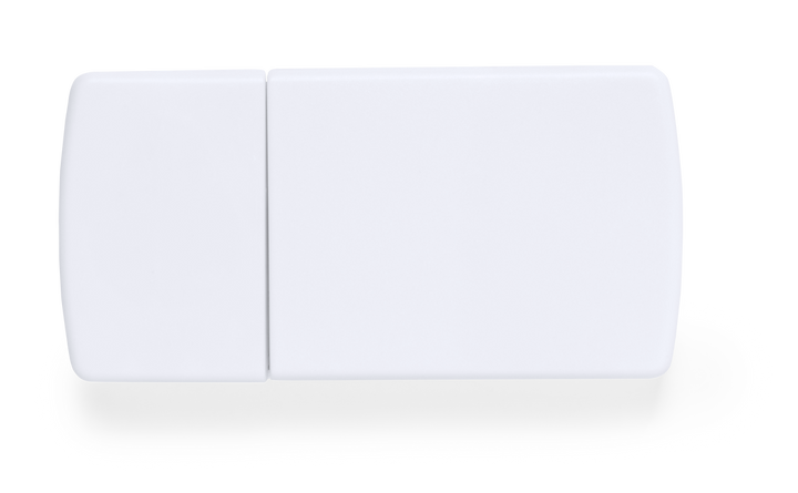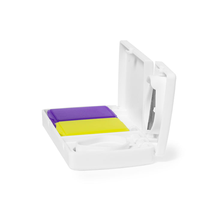 Pillendose aus glattem, robustem Material in Weiß. Mit 2 Innenfächern, Sicherheitsverschluss und Klinge zum Teilen der Pillen.