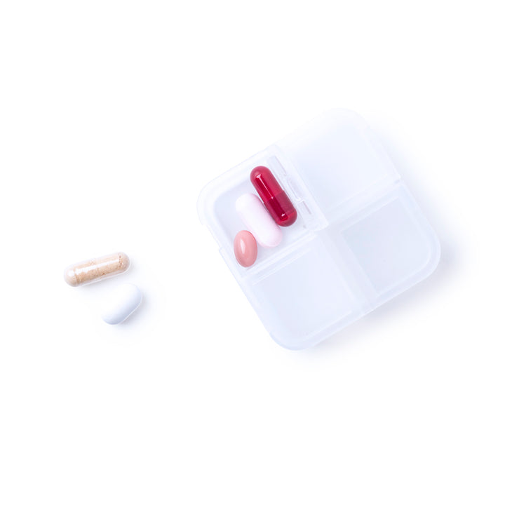 Pillendose aus BPA-freiem, halbtransparentem ABS. Mit 4 Fächern mit individuellen Deckeln.