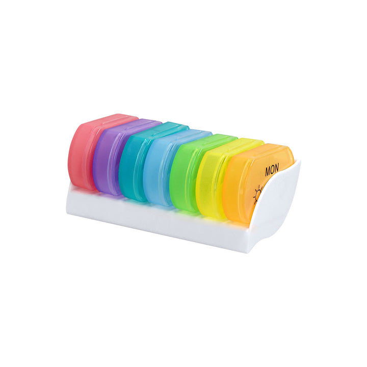 Wöchentlicher Pillenbehälter aus robustem PP. Enthält 7 Einzelbehälter, jeder mit einer entsprechenden Farbe und den Abkürzungen der Wochentage, was die Verwendung erleichtert. Jedes Fach ist in 2 unabhängige Fächer unterteilt, ideal zur Trennung der Morgen-, Nachmittag- oder Abenddosen.
