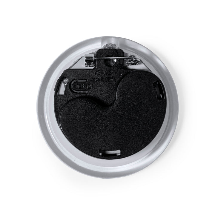 Original-Pin mit LED-Licht und Betrieb durch eine Knopfzellenbatterie (im Lieferumfang enthalten). Über den Knopf auf der Rückseite des Artikels kann das Licht in drei Positionen eingestellt werden (Dauerlicht und schnell/langsam blinkendes Licht). Mit Sicherheitsnadel zum Befestigen und präsentiert in einer individuellen Box im Kraftdesign.