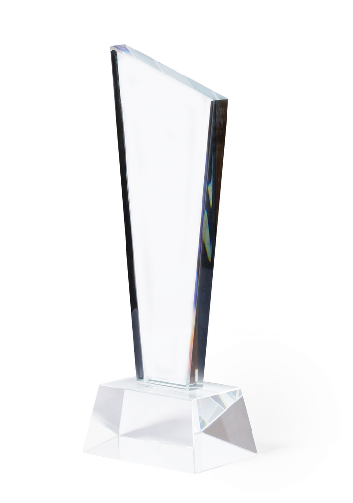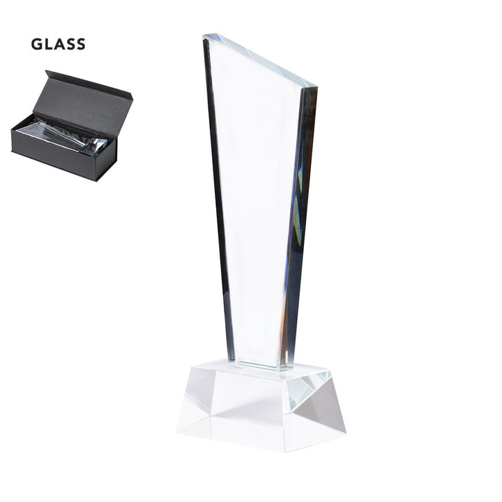 Trophäe aus dickem Glas mit exklusivem Design und widerstandsfähigem Sockel. Speziell für die Lasergravur entworfen und in einer Schutzhülle aus strapazierfähigem Karton mit Magnetverschluss und gestanztem Schaumstoff-Innenleben präsentiert.