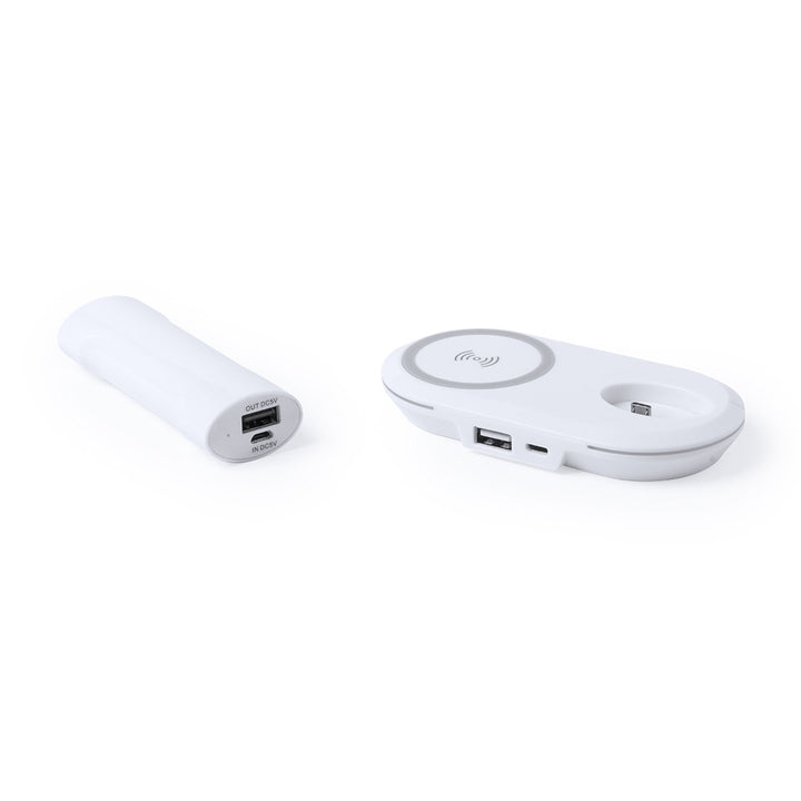Set 2 en 1 de cargador inalámbrico y power bank de 2.200 mAh de capacidad de carga. En elegante acabado de color blanco. Superficie de carga y base anti deslizantes. Entrada micro USB -cable incluido- y presentado en atractiva caja de diseño. Las capacidades mostradas en todas nuestras baterías auxiliares externas son reales, incorporando todas ellas baterías de grado A y no recicladas, con una vida útil de al menos 500 ciclos de carga y según normativa CE. Además, están fabricadas conforme a los estándares RoHS y en cumplimiento con los siguientes requisitos de seguridad: Sistema de protección contra sobrecarga del power bank. Sistema de protección contra descarga completa que proporciona una mayor durabilidad del power bank. Sistema de bloqueo para evitar cortocircuitos. Sistema de transferencia de carga constante, acorde con la capacidad del dispositivo de destino.