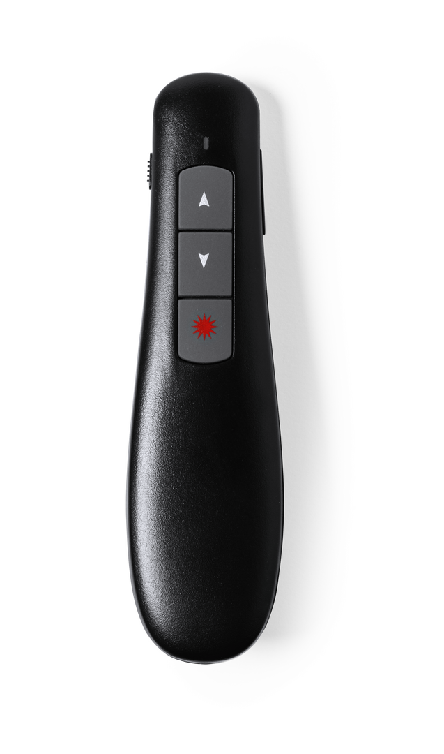 Puntero láser inalámbrico para presentaciones. De diseño ergonómico, incluye accesorio plug play para conectarlo al puerto USB del ordenador, sin necesidad de instalar software adicional para su correcto funcionamiento. Compatible con multitud de sistemas operativos (Windows, OS X, Linux y Android). Con botones avance/ pausa/ retroceso/volumen y alimentación a pilas: 2xAAA incluidas. Presentado en elegante y resistente estuche de cartón negro, con funda e interior troquelado en espuma. Manual de instrucciones en español e inglés.