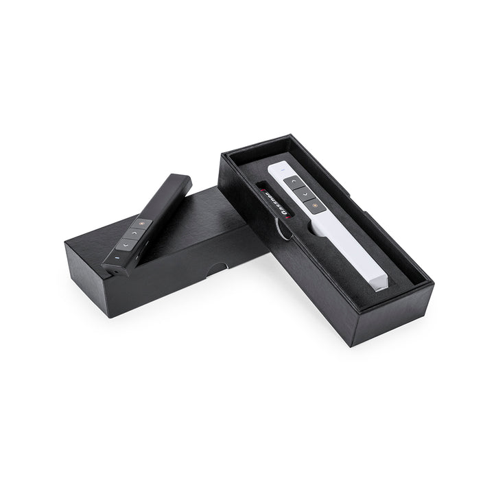Eleganter Laserpointer der Klasse 2 mit USB-Anschluss und geschmeidigem Gehäuse. Speziell geeignet für PowerPoint- und Keynote-Präsentationen dank der seitlichen Tasten mit Vorwärts-, Pause- und Rückwärtsfunktion. Batteriebetrieben - 1 x AAA inklusive. Speziell für den Tampondruck entwickelt. Präsentiert in einer eleganten und robusten Schachtel aus schwarzem Karton, mit weichem Schaumstoff mit Stanzung im Inneren und Batteriefach.