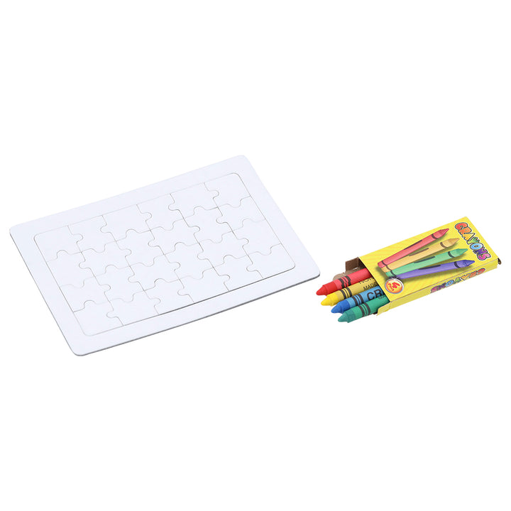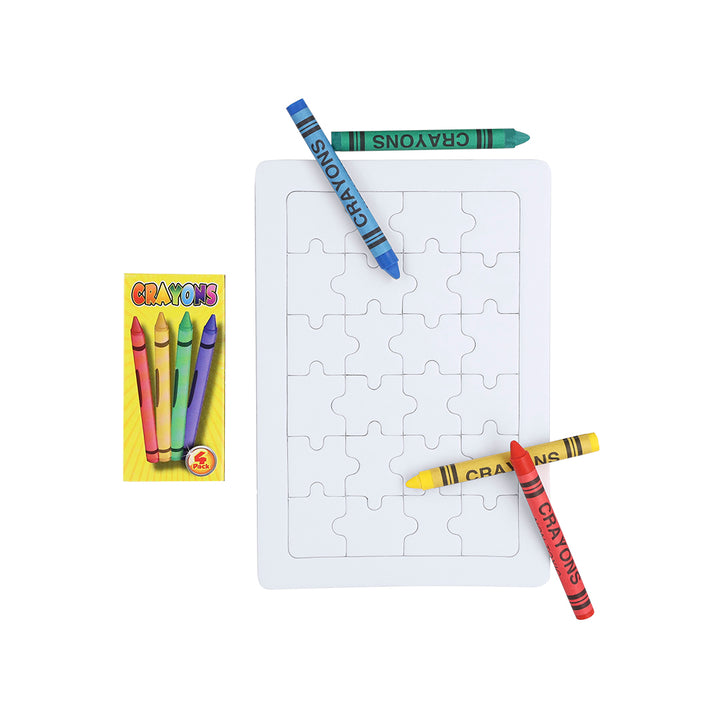 Lustiges Puzzle mit 24 Teilen in Weiß. Mit 4 Wachsmalstiften in den Farben Gelb, Grün, Blau und Rot.