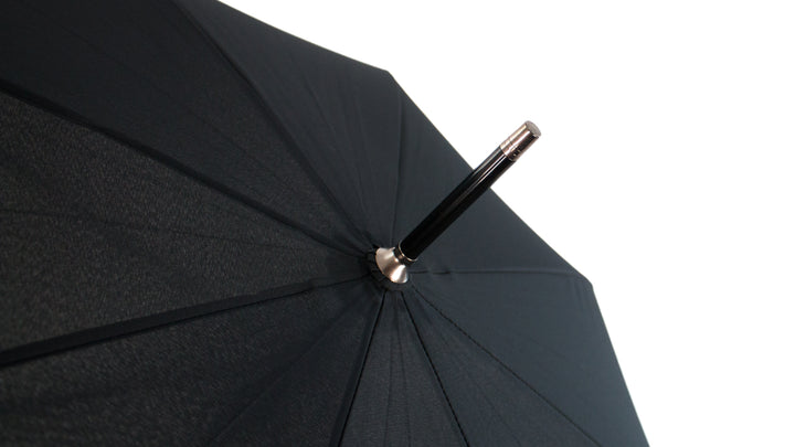 Der Regenschirm Royal von Antonio Miró ist der perfekte Schutz an regnerischen Tagen. Mit seinen 8 Panelen aus strapazierfähigem Pongee-Material in klassischem Schwarz und edler weißer Paspelierung verbindet er stilvolles Design mit herausragender Funktionalität.